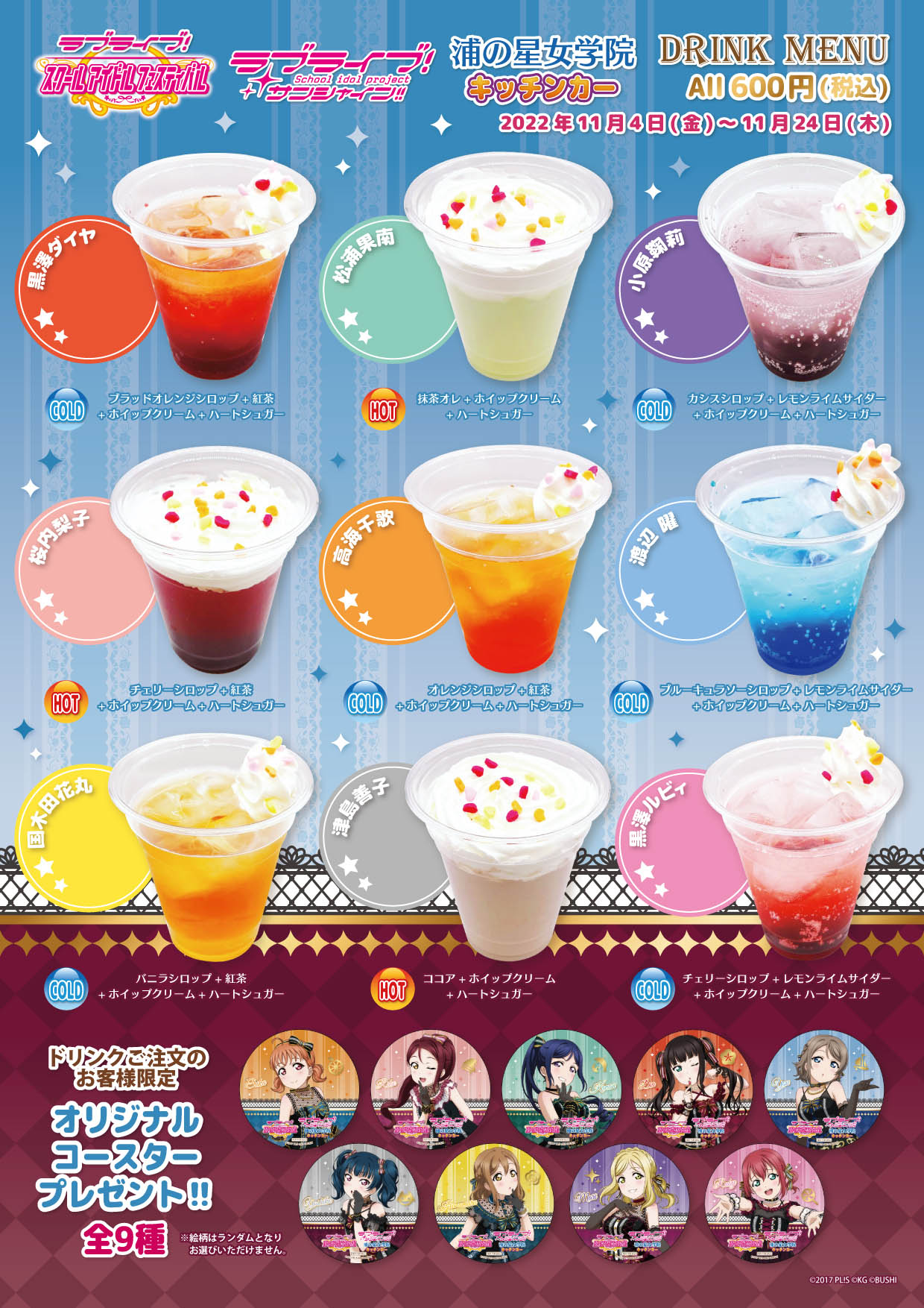 営業時間・場所等の詳細は今後随時ご案内致しますので、浦の星女学院キッチンカー公式twitterのチェックをお願いします。