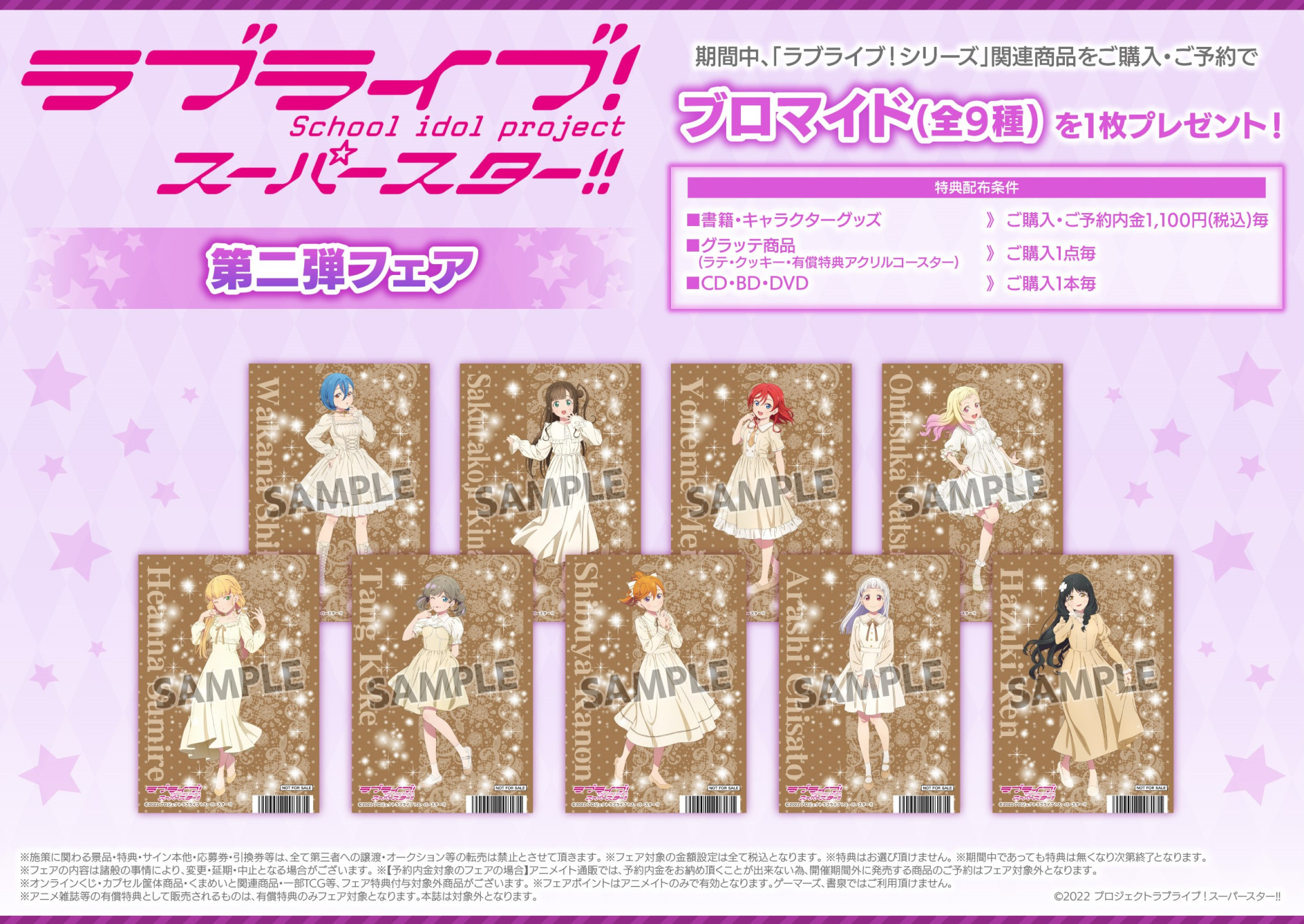 期間中、「ラブライブ!シリーズ」関連の書籍・キャラクターグッズをご購入・ご予約内金1,100円(税込)毎、グラッテ商品(ラテ・クッキー・有償特典アクリルコースター)をご購入1点毎、CD・BD・DVDをご購入1本毎にブロマイド(全9種)を1枚プレゼント!