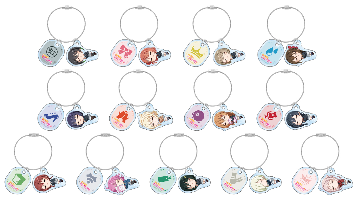 高咲 侑、上原 歩夢、中須 かすみ、桜坂 しずく、朝香 果林、宮下 愛、近江 彼方、優木 せつ菜、エマ・ヴェルデ、天王寺 璃奈、三船 栞子、ミア・テイラー、鐘 嵐珠のイラストを2連ワイヤーアクリルキーホルダーに仕上げました。