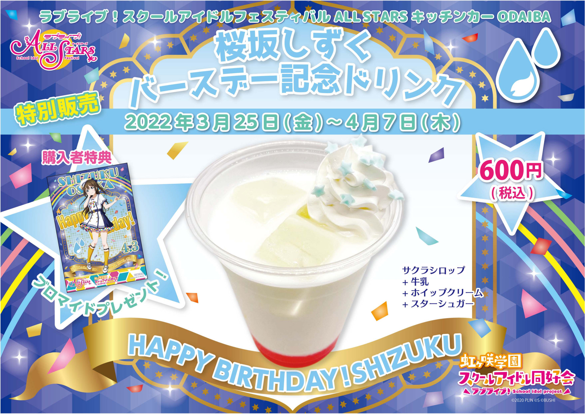 下記期間でバースデー記念ドリンクメニューの販売、記念ドリンク購入者様への特典ブロマイドお渡し、メッセージボードの展示をいたします。