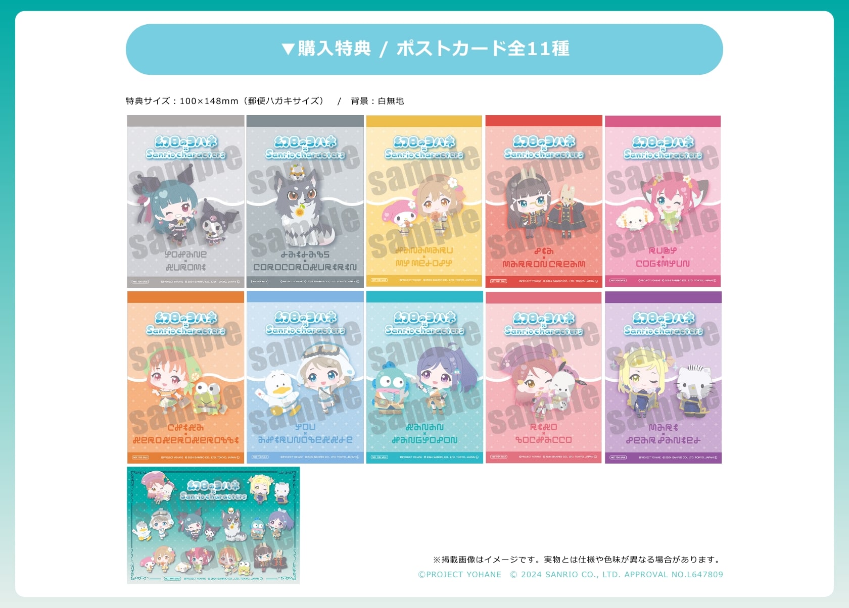 購入特典は全11種類のポストカードをランダムで配布いたします。各店舗では、コラボイラストのミニパネルを展示いたします♪