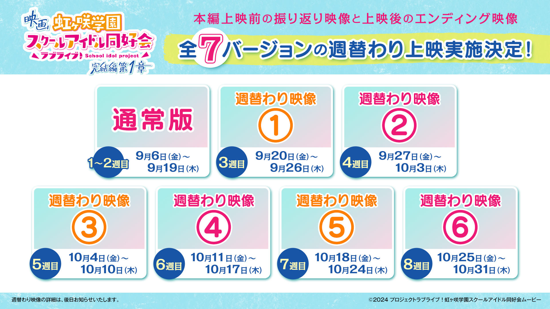 1・2週目は通常版(1種)を上映、3~8週目までは各週、週替わりバージョン(全6種)で上映されます!詳細は続報をお待ちください!