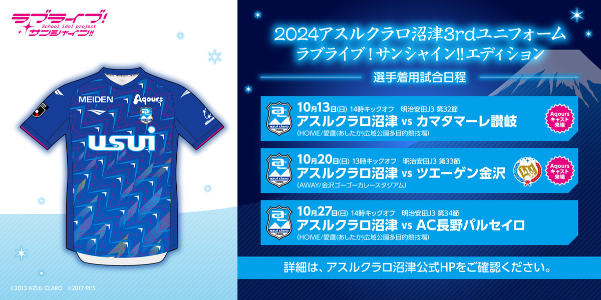 今回のコラボユニフォーム「2024アスルクラロ沼津 3rdユニフォーム ラブライブ!サンシャイン!!エディション」は、Aqoursキャスト来場試合や、金沢で開催のラブライブ!ダービーを含む 明治安田J3リーグ公式戦 3試合での選手着用が決定しています!