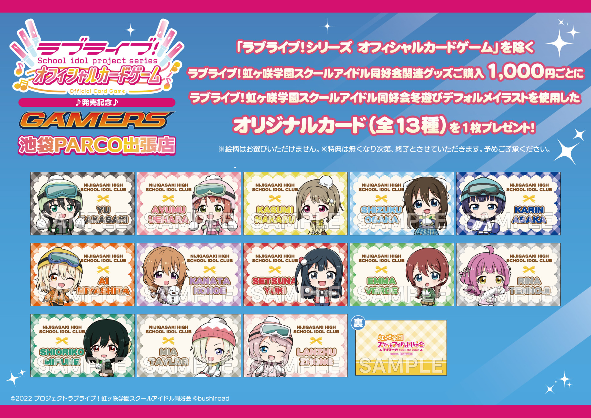 「ラブライブ!シリーズ オフィシャルカードゲーム」を除くラブライブ!シリーズ関連グッズご購入1,000円(税込)ごとにシリーズに応じた冬遊びデフォルメイラストを使用したオリジナルカードを1枚プレゼント!