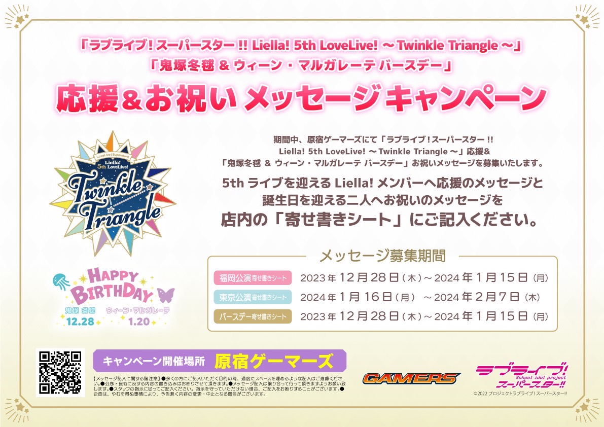 原宿ゲーマーズより「ラブライブ!スーパースター!! Liella! 5th LoveLive! ~Twinkle Triangle~」応援&「鬼塚冬毬&ウィーン・マルガレーテバースデー」お祝いメッセージキャンペーン開催のお知らせ