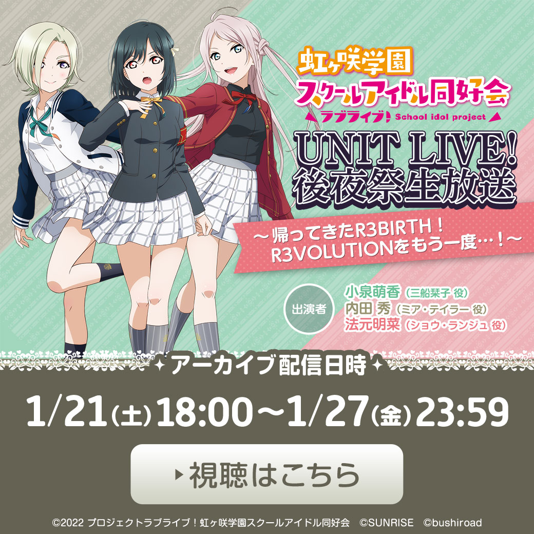 「ラブライブ!虹ヶ咲学園スクールアイドル同好会生放送 UNIT LIVE! 後夜祭生放送 ~帰ってきたR3BIRTH!R3VOLUTIONをもう一度…!〜」アーカイブ配信決定!